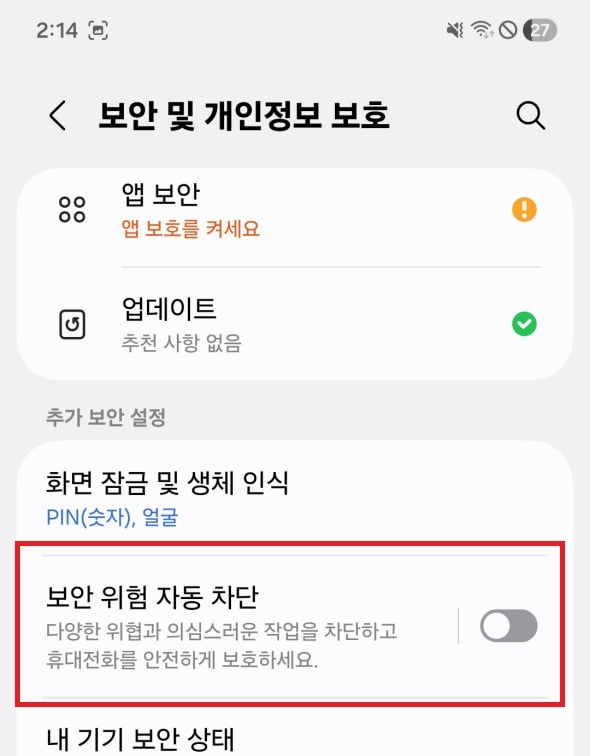 - 설정 > 보안 및 개인정보 보호 > 보안 위험 자동 차단