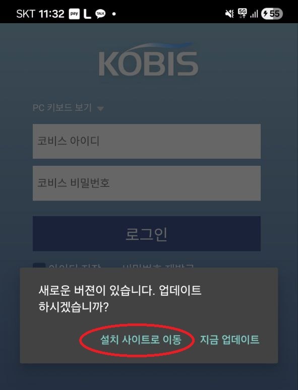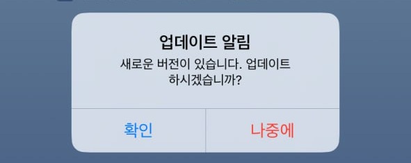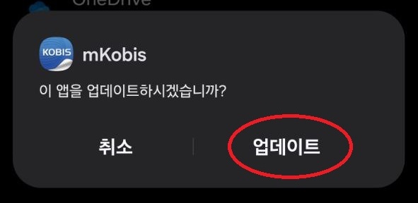 코비스 앱을 실행하면 업데이트 안내 메시지가 나타납니다.