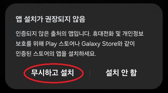④ '앱 설치 권장' 안내창에서 "무시하고 설치" 선택