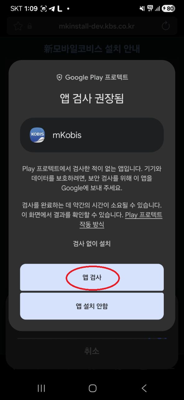 ⑤ '앱 검사 권장' 안내창에서 "앱 검사" 선택