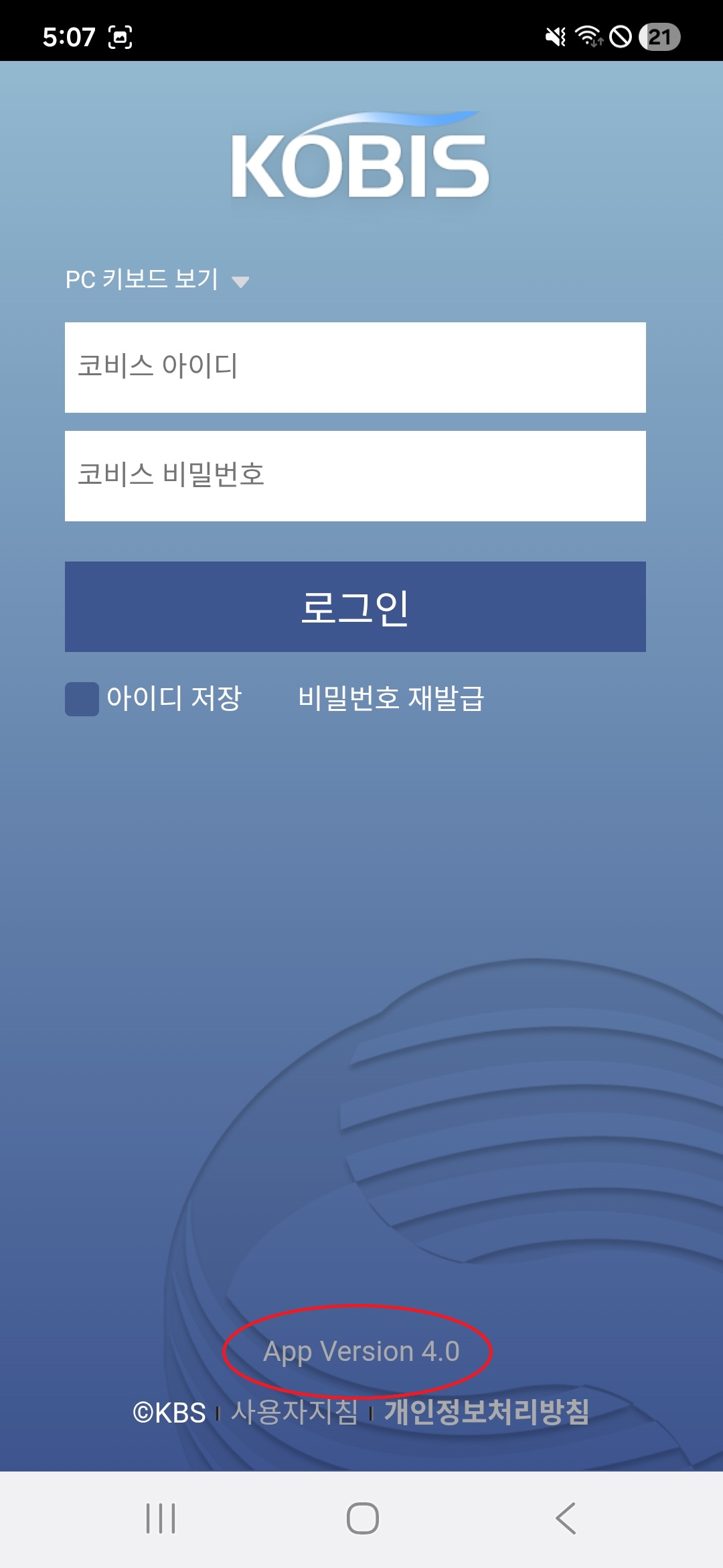 - 설치 후 모바일 코비스 로그인 페이지 하단에 앱 버전(4.0)을 확인하여 주십시오
